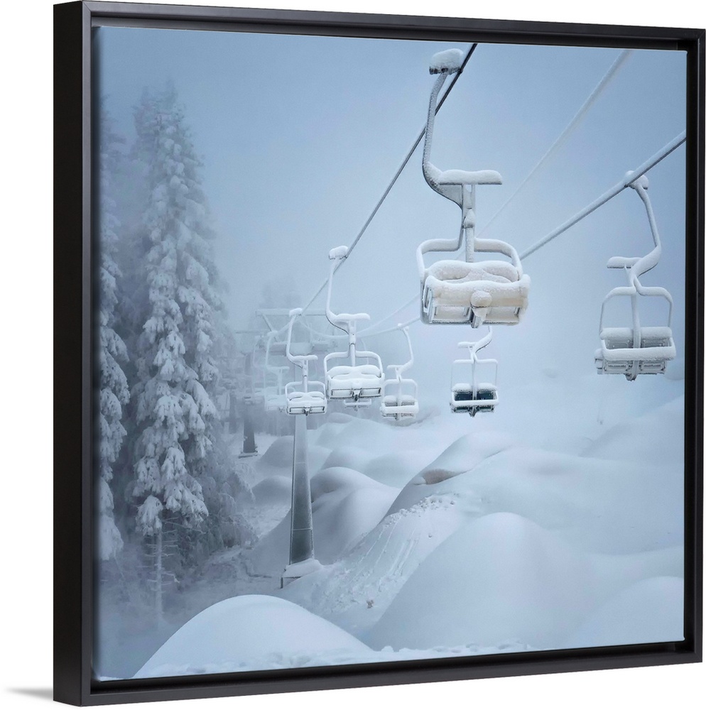 <p>A ski lift and surrounding landscape covered in snow.</p>