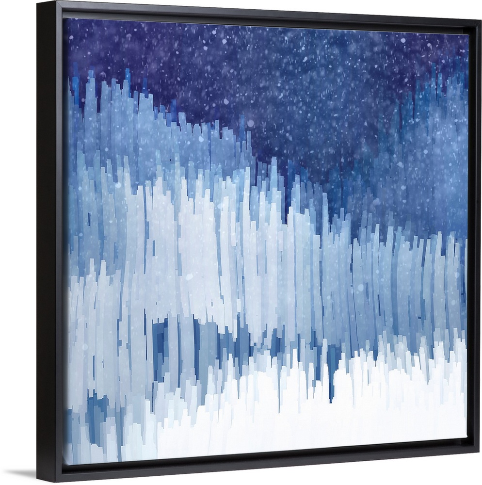<p>Square abstract with small vertical lines stacked in rows in shades of blue and white with a dark blue background and white specks resembling a snowy Winter landscape.</p>