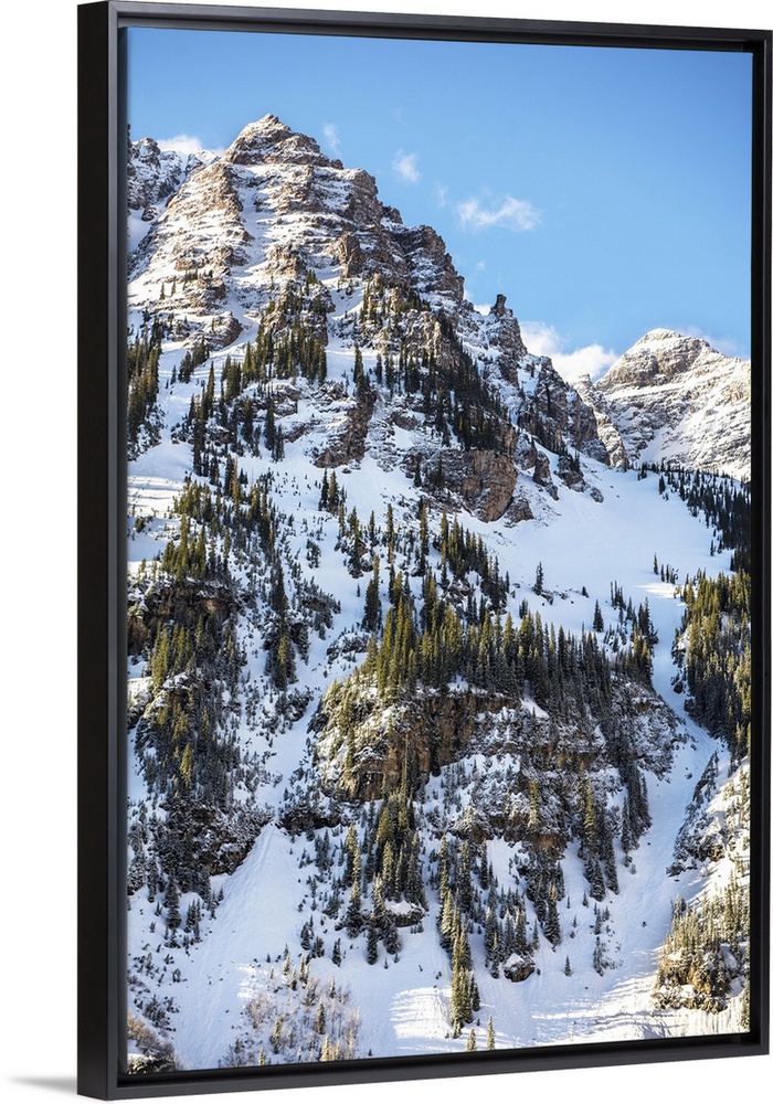 <p>Snow and pine trees on the mountainside under a blue sky, Maroon Bells, Colorado.</p>