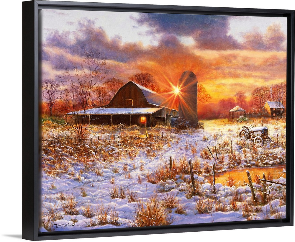 <p>Sunset over barn in snowy field.</p>