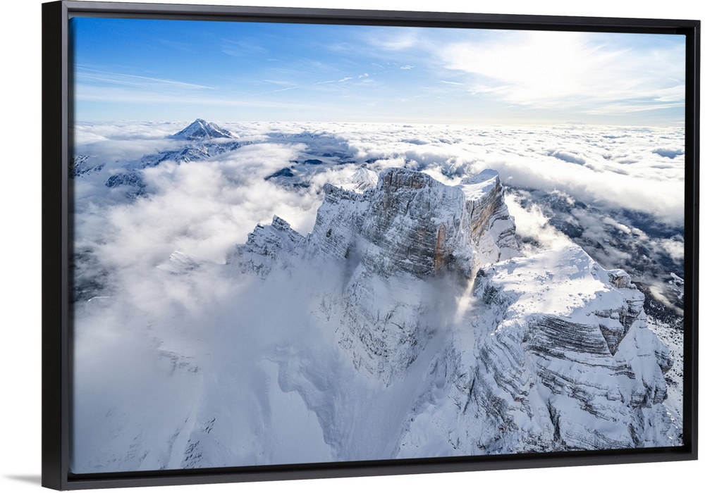 <p>Snow capped Monte Pelmo emerging from clouds, aerial view, Dolomites, Belluno province, Veneto, Italy, Europe</p>