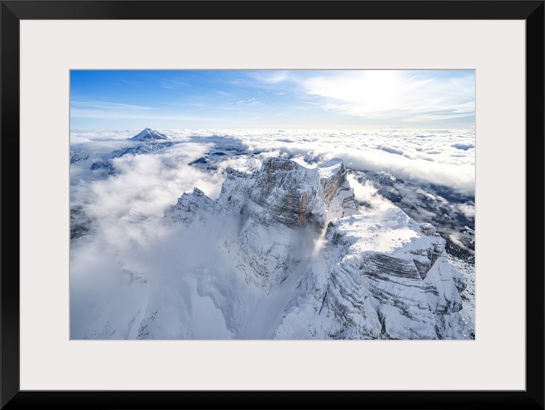 <p>Snow capped Monte Pelmo emerging from clouds, aerial view, Dolomites, Belluno province, Veneto, Italy, Europe</p>