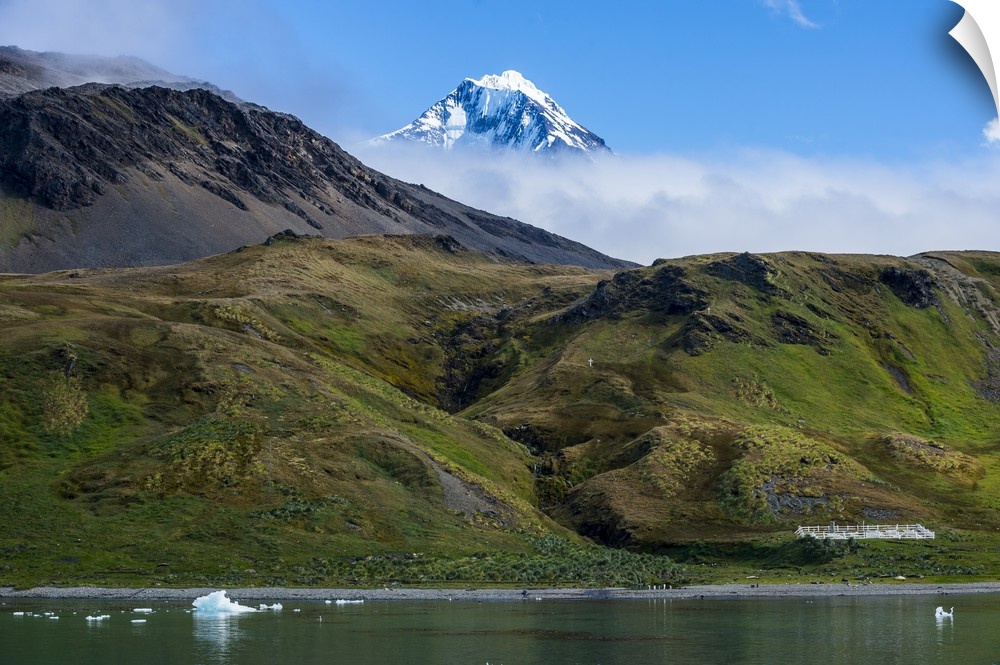 <p>Snow capped mountain breaking through the cloud, Grytviken, South Georgia, Antarctica, Polar Regions</p>