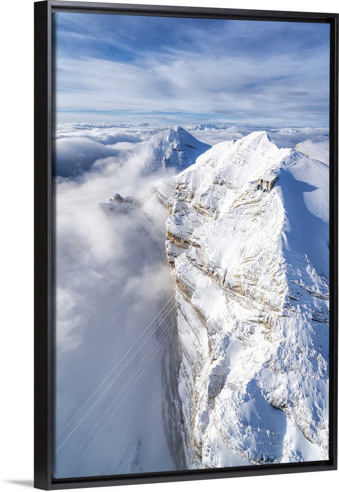 <p>Aerial view of snow capped Tofane group and scenic Freccia nel Cielo cableway, Dolomites, Belluno province, Veneto, Italy, Europe</p>