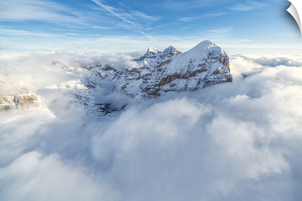 <p>Aerial view of the snow capped Tofane group in a sea of clouds, Dolomites, Belluno province, Veneto, Italy, Europe</p>