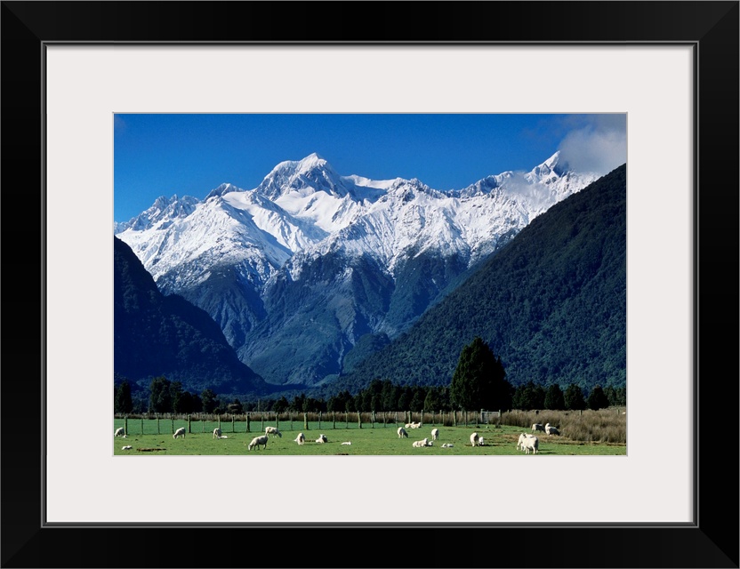 <p>Snow-clad Mount Tasman rises above green sheep pastures from near the town of Fox Glacier on the west coast of the South Island of New Zealand.</p>