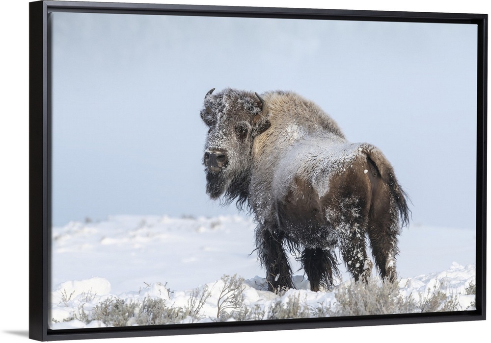 <p>View taken from behind a snow covered American bison (Bison bison) looking back at the camera while roaming the snowy fields in Yellowstone National Park in winter Wyoming, United States of America</p>