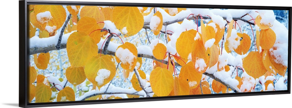 <p>Panoramic photograph focuses on a tree branch filled with brightly colored leaves that have been recently blanketed by fresh Winter precipitation.</p>