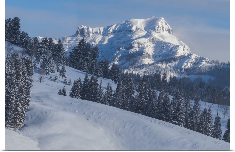 <p>View of snow covered Barronette Peak in the Absaroka Range on a sunny winter day in Yellowstone National Park Wyoming, Unites States Of America</p>