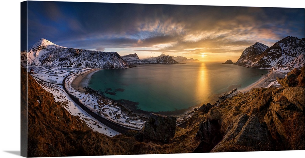<p>Snow covered beach at sunset, vikbukta bay, vik beach, haukland beach, vestvagoya, lofoten, nordland county, norway.</p>