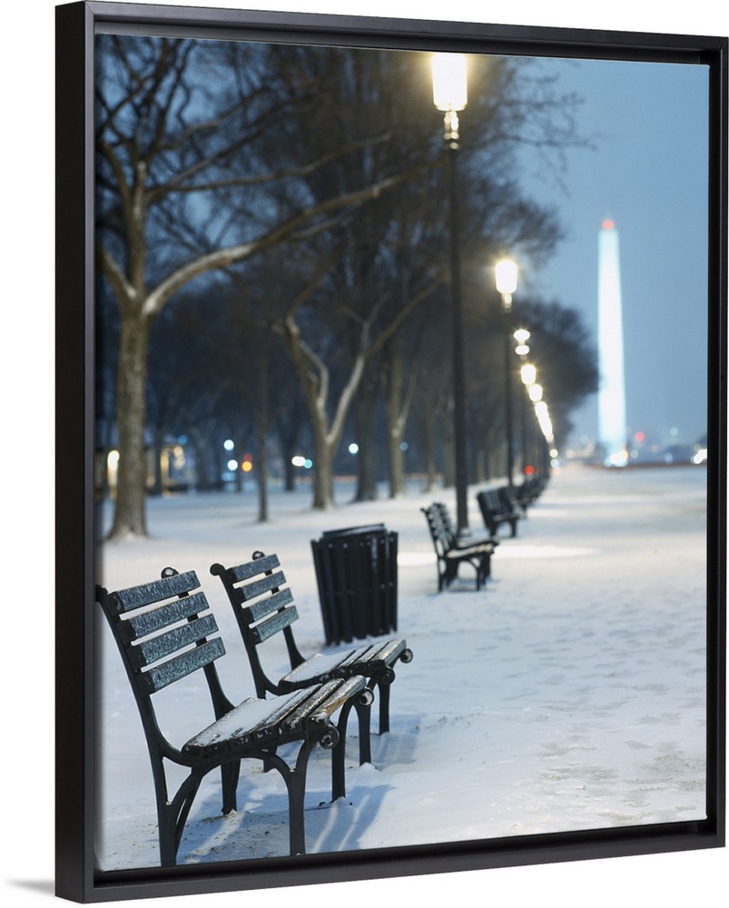<p>Snow covers the National Mall and rows of out of focus benches and street lights in this vertical landscape photograph.</p>
