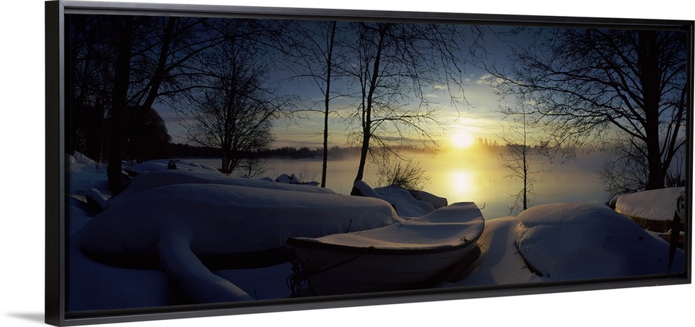 <p>Panoramic photograph displays a group of rowboats blanketed in fresh powder sitting near the shore of a river in Europe. Over the horizon in the distance, the sun can be seen glowing over the fog covered river.</p>