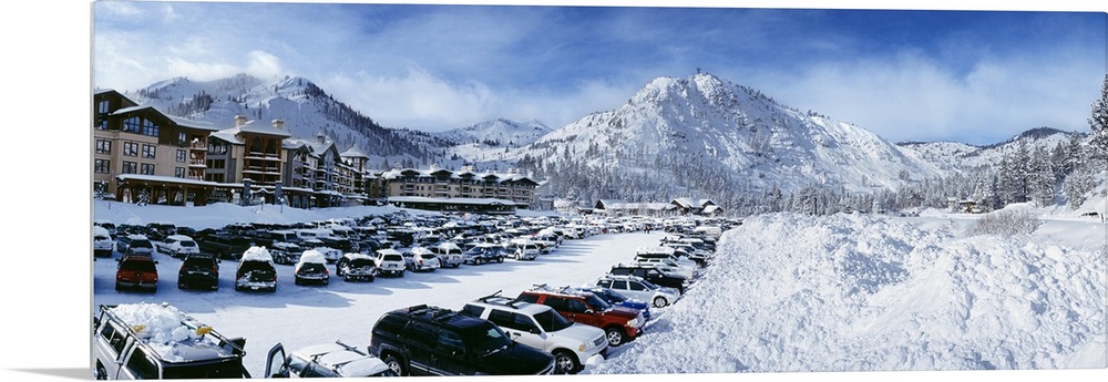<p>Snow covers the mountains, ground and cars that sit parked at a large ski resort in Lake Tahoe.</p>