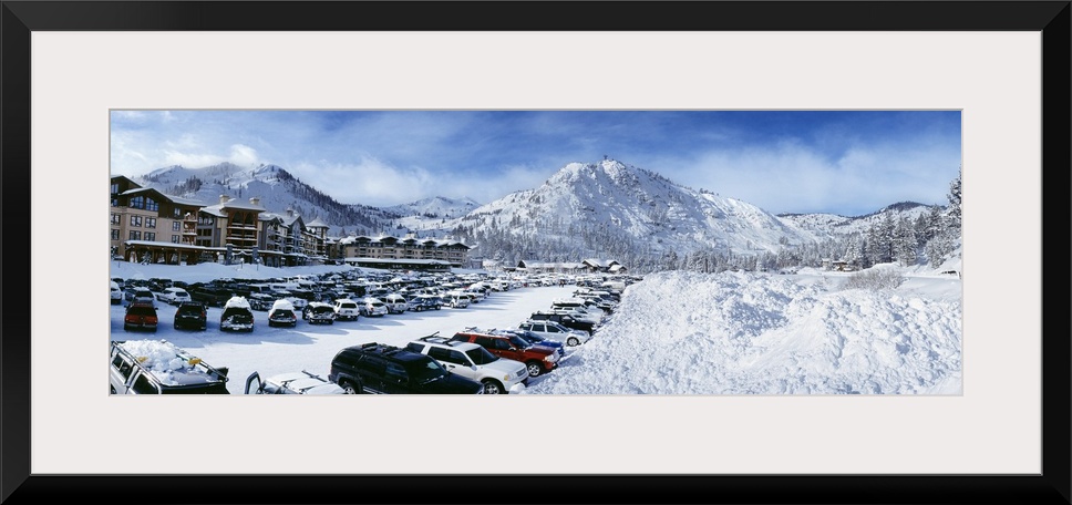 <p>Snow covers the mountains, ground and cars that sit parked at a large ski resort in Lake Tahoe.</p>