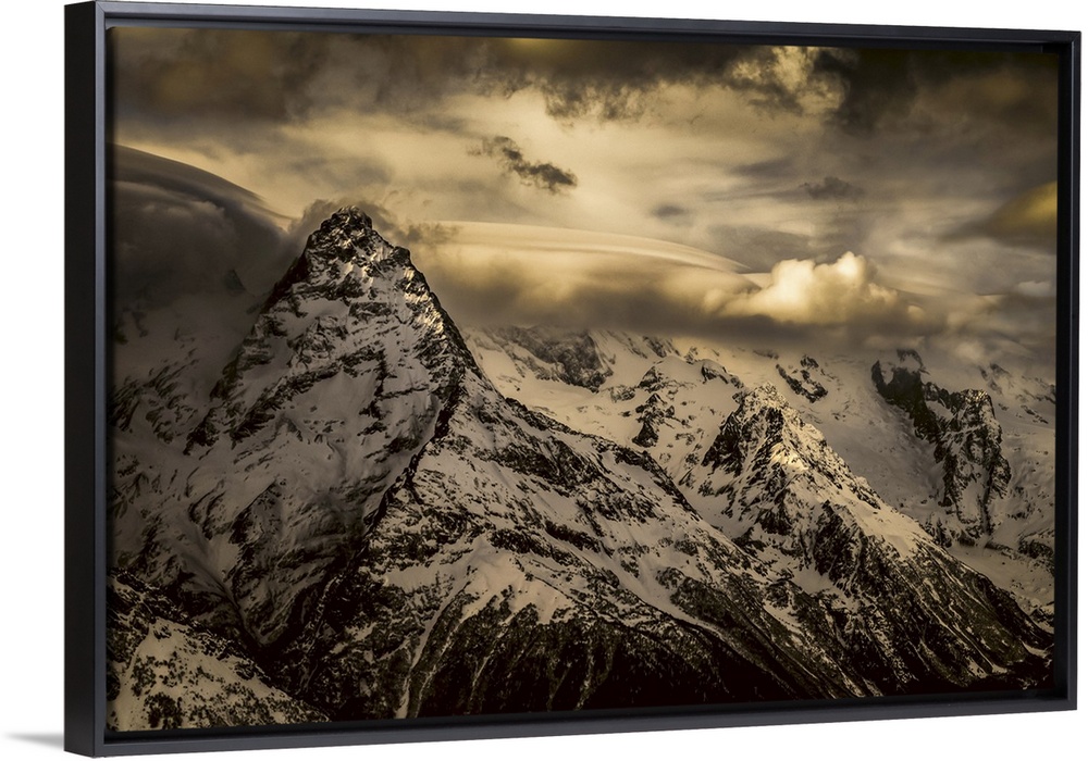 <p>Dramatic view of snow-covered Caucasus mountains and glowing clouds, dombay region, Karachaevo-Cherkesskaya republic, Russia.</p>