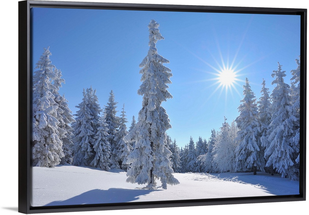 <p>Snow covered Conifer Trees with Sun, Winter, Grosser Beerberg, Suhl, Thuringia, Germany</p>