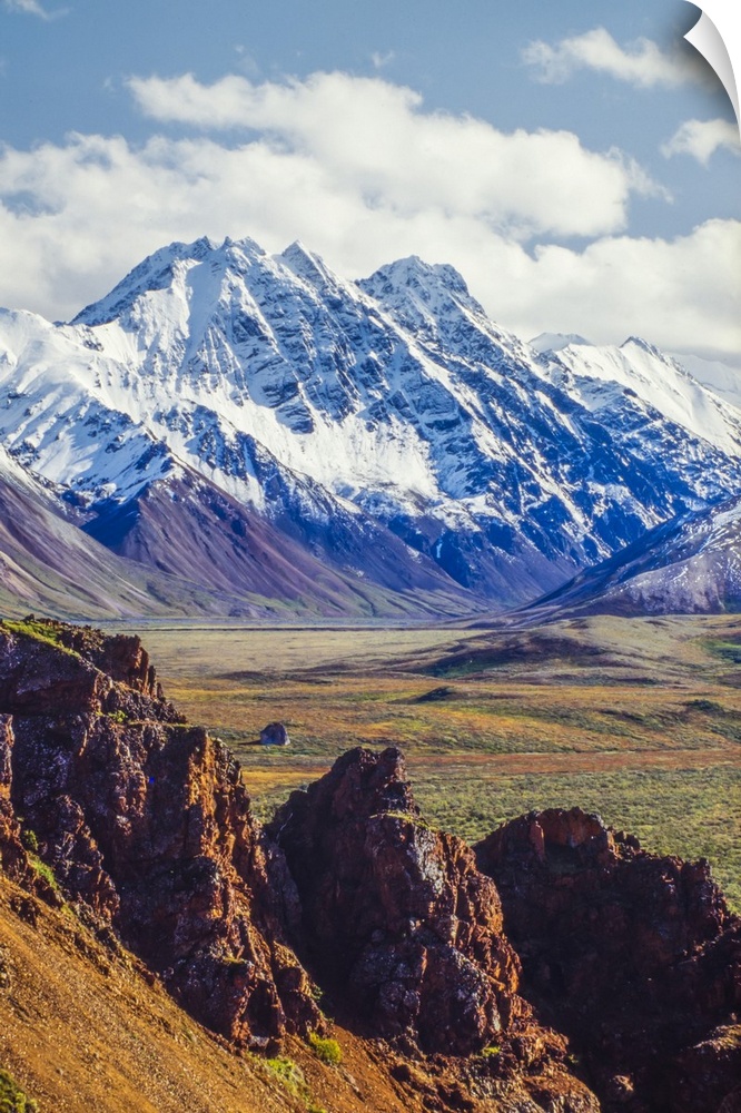 <p>Snow covered Denali with rocky cliffs and colorful foliage on the tundra in Denali National Park Alaska, United States of America</p>
