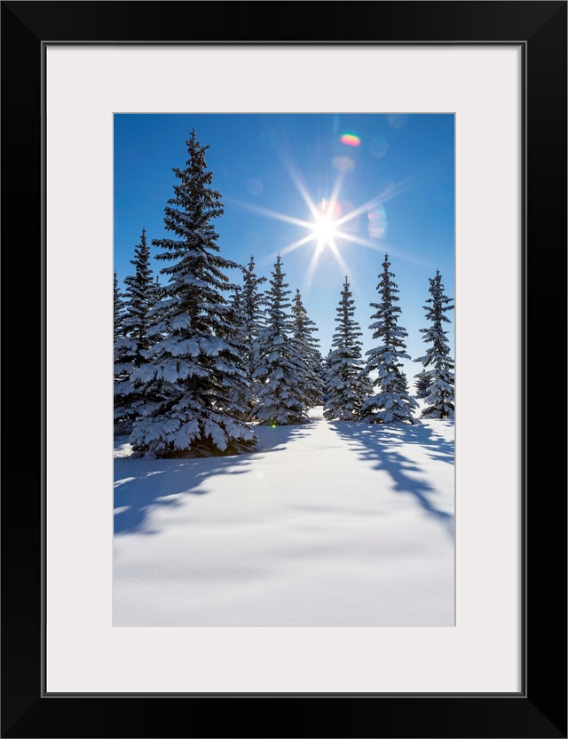 <p>Snow covered evergreen trees on a snow covered hillside with blue sky and sun burst; Calgary, Alberta, Canada</p>