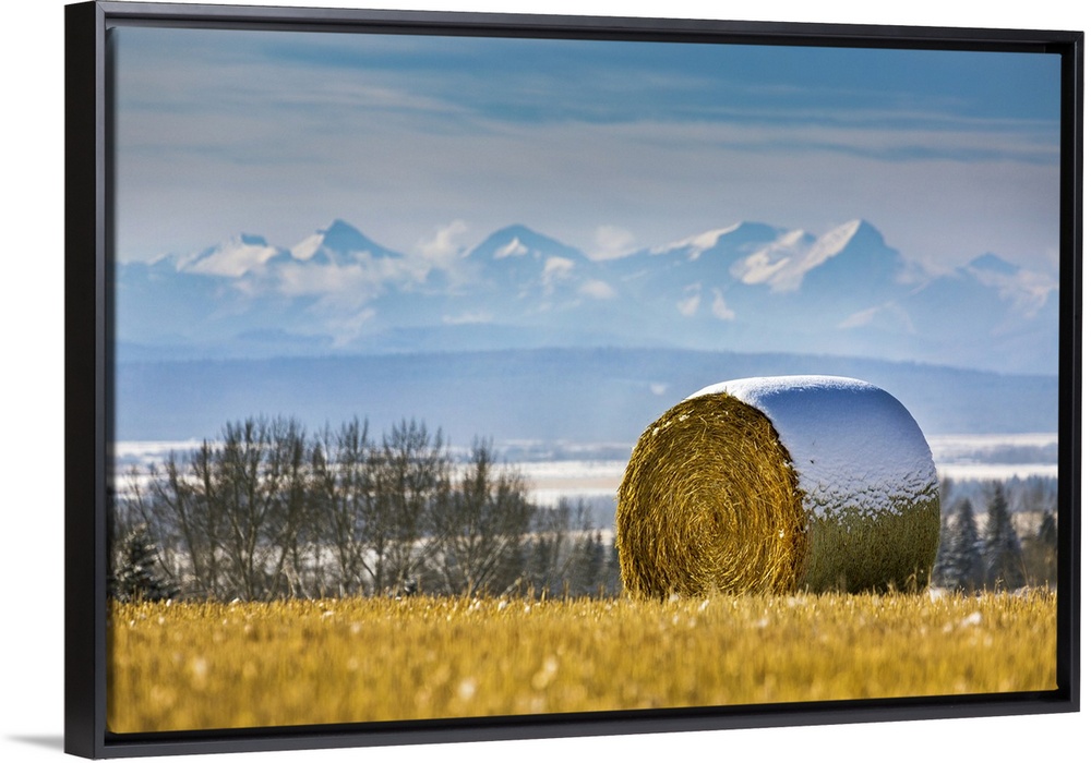 <p>Snow-covered hay bale in a stubble field with snow-covered mountains and foothills in the background with clouds and blue sky, West of Calgary; Alberta, Canada</p>