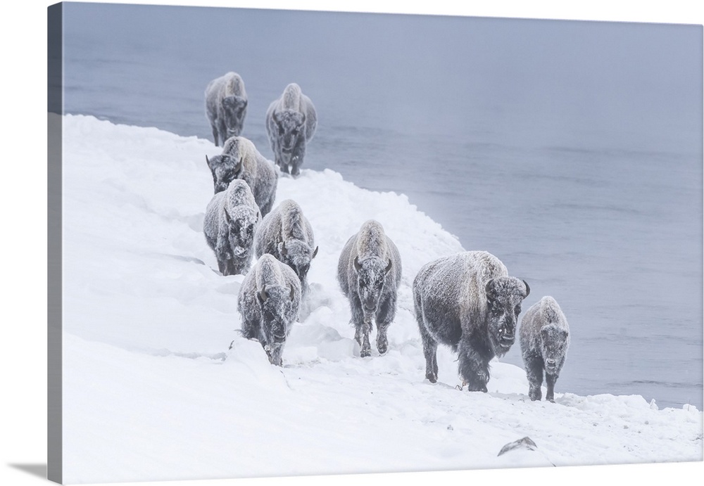 <p>Snow covered herd of American bison (Bison bison) walking along the riverbank of Firehole River in Yellowstone National Park in winter Wyoming, United States of America</p>