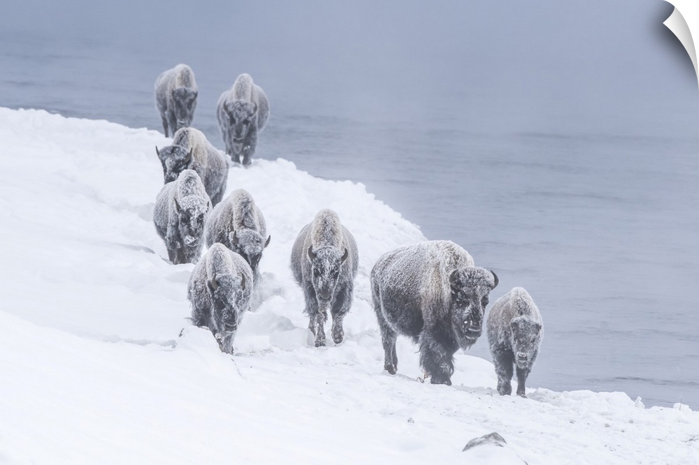 <p>Snow covered herd of American bison (Bison bison) walking along the riverbank of Firehole River in Yellowstone National Park in winter Wyoming, United States of America</p>