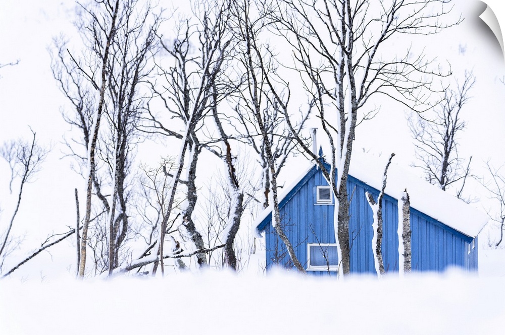 <p>Isolated house covered with snow framed by frozen trees, Kvaloya, Sommaroy, Troms county, Norway</p>