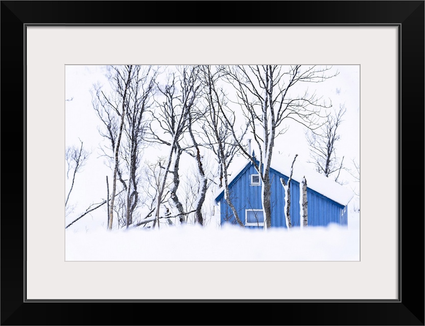 <p>Isolated house covered with snow framed by frozen trees, Kvaloya, Sommaroy, Troms county, Norway</p>