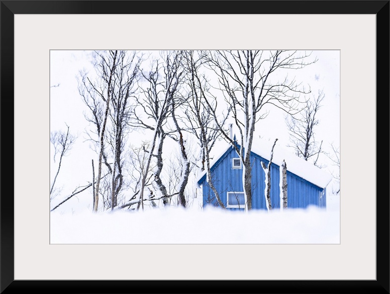 <p>Isolated house covered with snow framed by frozen trees, Kvaloya, Sommaroy, Troms county, Norway</p>