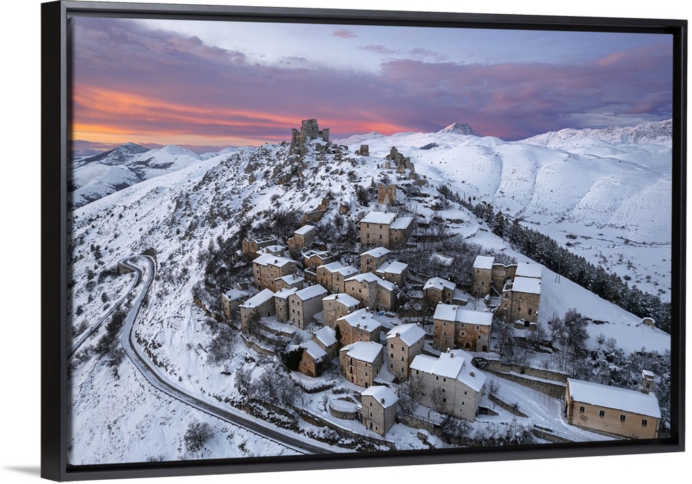 <p>Aerial winter view of the snow covered medieval village of Rocca Calascio with the castle and pink clouds at dusk, Rocca Calascio, Gran Sasso e Monti della Laga National Park, Campo Imperatore, L'Aquila province, Abruzzo region, Italy, Europe</p>