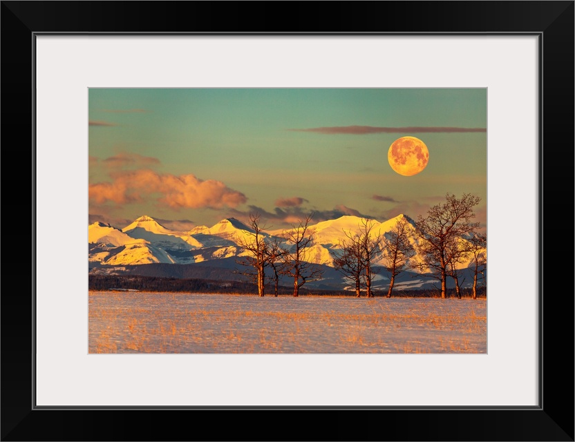 <p>Snow-covered mountain range reflecting warm light at sunrise with a warm glowing full moon, clouds in a blue sky, and a snow-covered field and trees in the foreground, West of Calgary, Alberta, Canada</p>