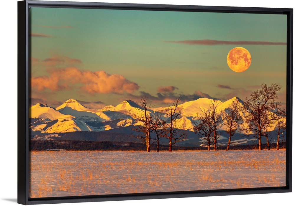<p>Snow-covered mountain range reflecting warm light at sunrise with a warm glowing full moon, clouds in a blue sky, and a snow-covered field and trees in the foreground, West of Calgary, Alberta, Canada</p>