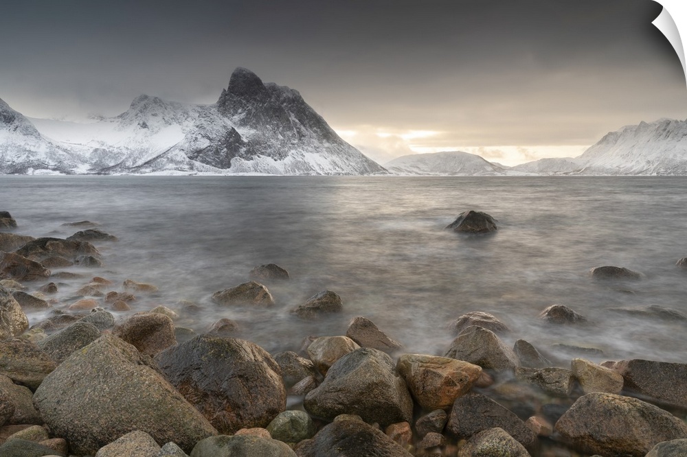 <p>Snow covered mountains near to Stonglandseidet on the island of Senja, Troms og Finnmark, Norway, Scandinavia, Europe</p>