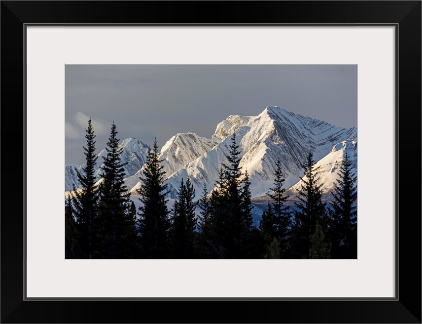 <p>Snow covered mountains with early morning light, silhouetted forest in the foreground; Kananaskis Country, Alberta, Canada</p>