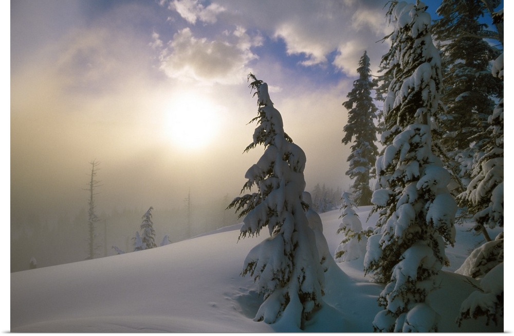 <p>Sun burning off the morning fog on a cold and snowy day with snow covered pine trees in the foreground.</p>