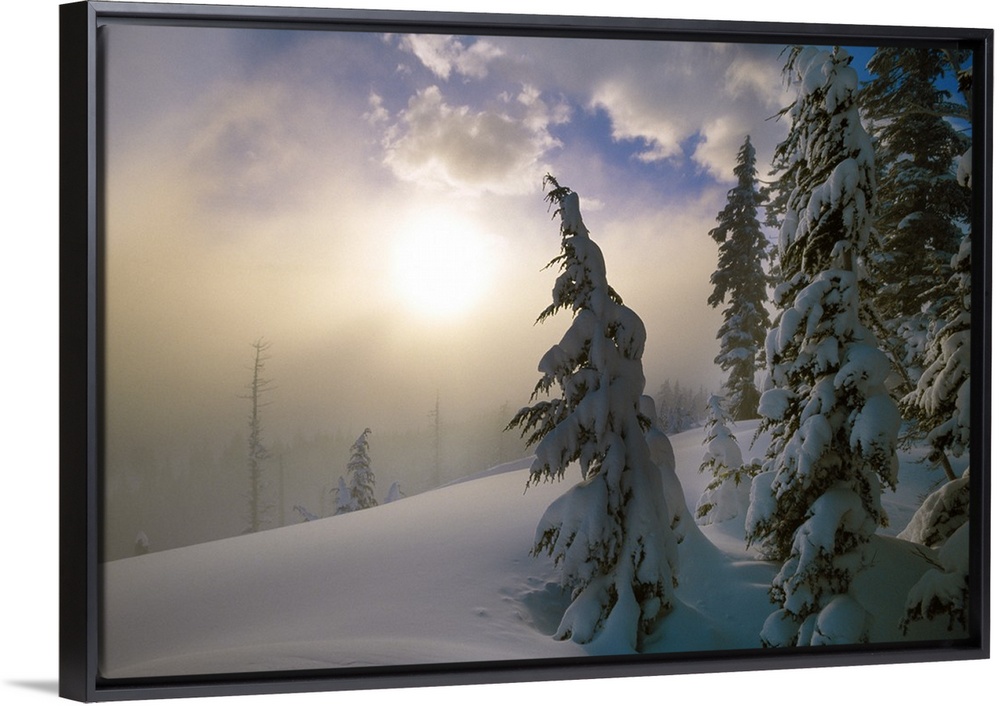 <p>Sun burning off the morning fog on a cold and snowy day with snow covered pine trees in the foreground.</p>