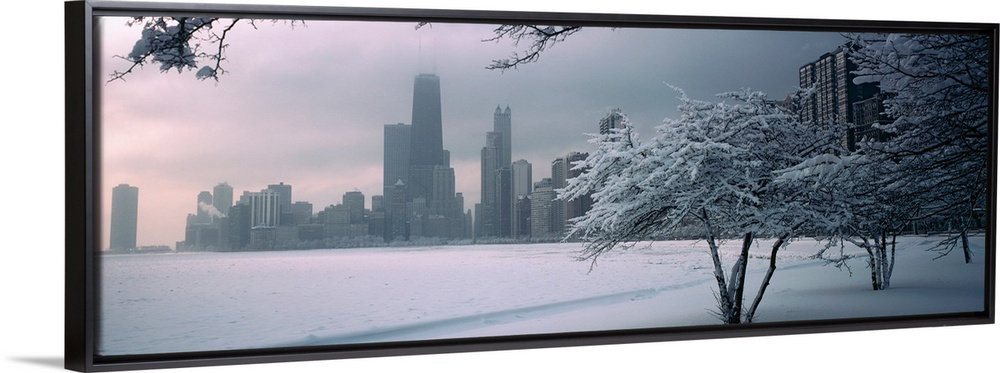 <p>Panoramic photograph of winter snow on a shore with a city skyline in the distance. There are trees on the shore in the foreground that are also blanketed with snow.</p>