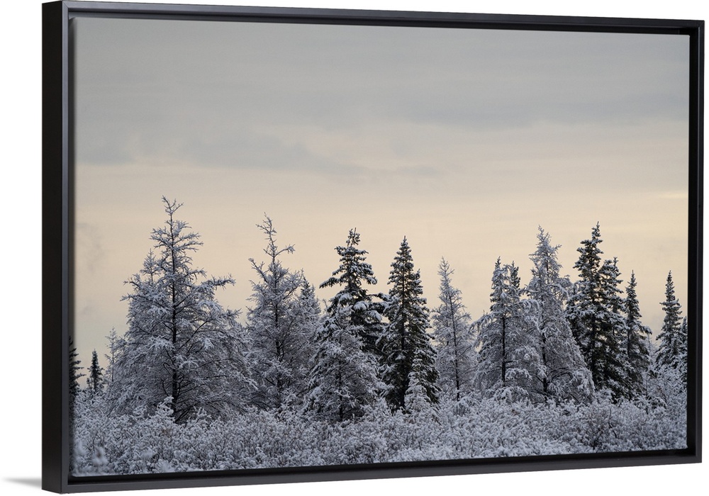<p>Snow-covered trees on a cold morning, near Churchill, Manitoba, Churchill, Manitoba, Canada</p>