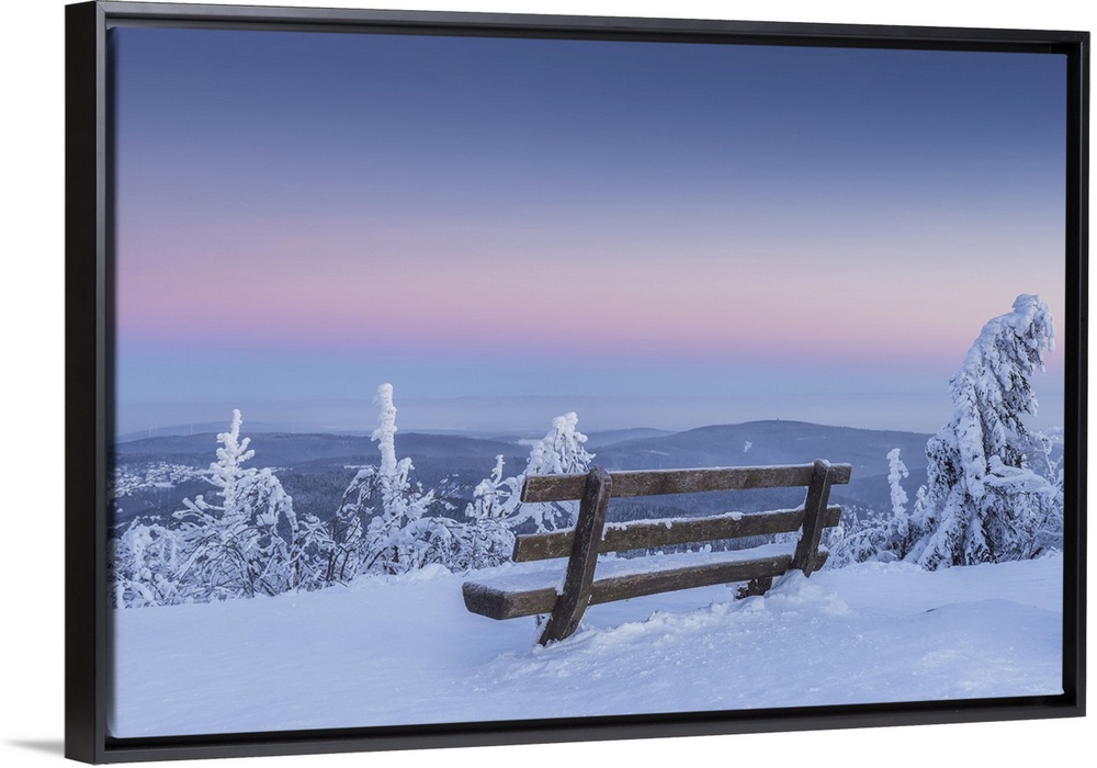 <p>Snow Covered Winter Landscape with Bench at Dawn, Grosser Feldberg, Frankfurt, Taunus, Hesse, Germany</p>