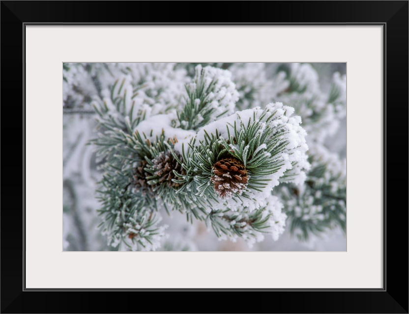 <p>Snow covers the branches of a lodgepole pine tree (Pinus contorta), United States of America</p>