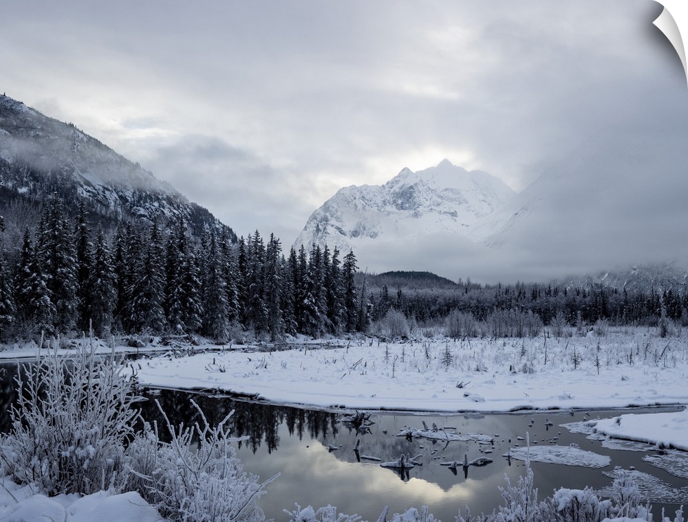 <p>Snow covers the mountainous and forested landscape in Chugach state park, eagle river, Alaska, united states of America.</p>