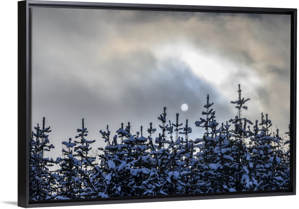 <p>Snow covers the tops of coniferous trees and the clouds obscure the full moon; British Columbia, Canada.</p>