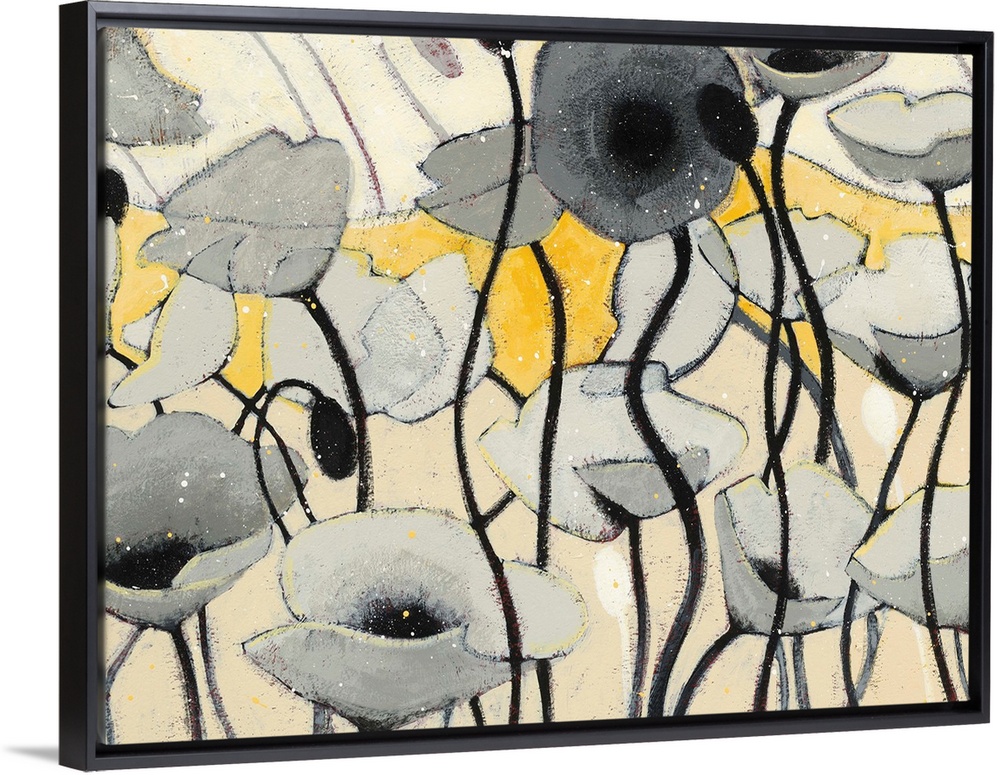 <p>A contemporary painting of gray poppies against a background of multi-yellow tones.</p>