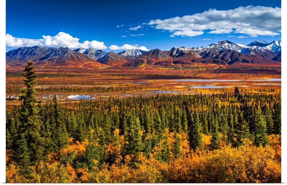 <p>Snow dusted Chugach Mountains in vivid fall colours, South-central Alaska in autumn; Alaska, United States of America.</p>