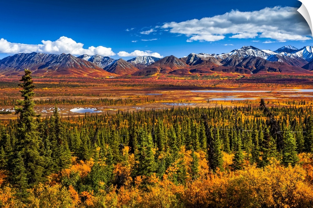 <p>Snow dusted Chugach Mountains in vivid fall colours, South-central Alaska in autumn; Alaska, United States of America.</p>