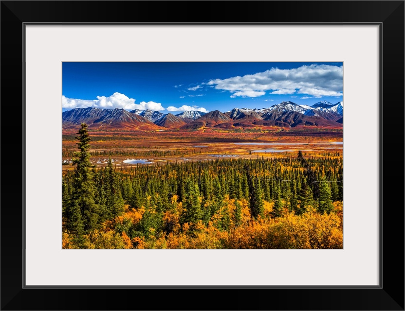 <p>Snow dusted Chugach Mountains in vivid fall colours, South-central Alaska in autumn; Alaska, United States of America.</p>