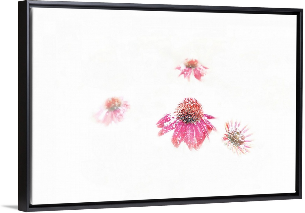 <p>Snow-dusted Echinacea blossoms emerge from a bright white background; Weaverville, North Carolina, United States of America</p>