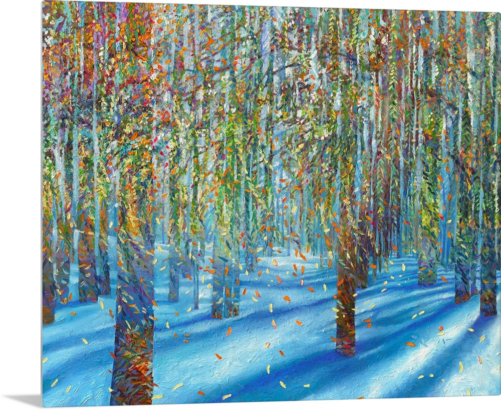 <p>Brightly colored contemporary artwork of leaves falling from trees in the snow.</p>