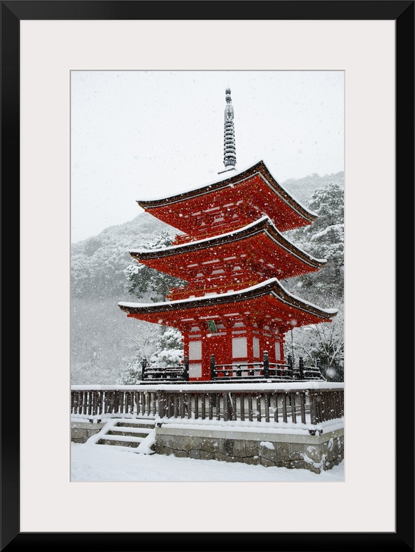 <p>Snow falling on small red pagoda, Kiyomizu-dera Temple, Kyoto, Japan</p>