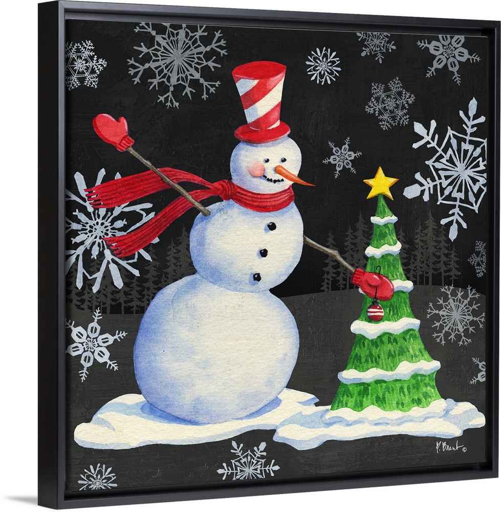 <p>Cute artwork of a jolly snowman surrounded by snowflakes, decorating a tree.</p>