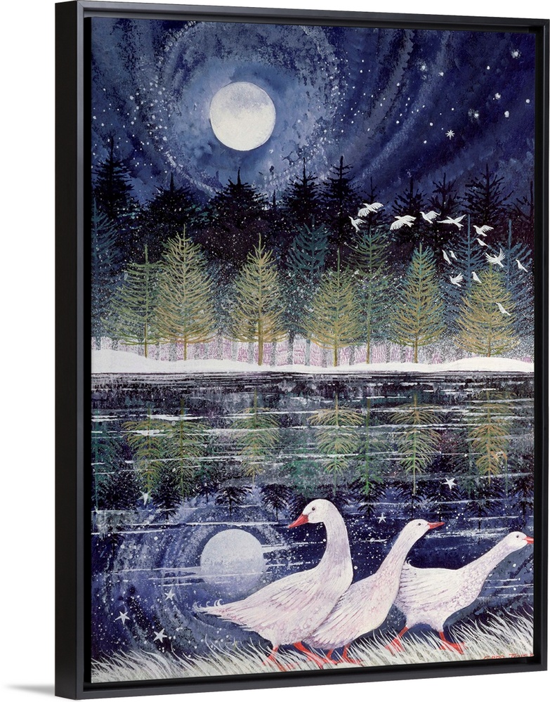 <p>Contemporary painting of three geese at the edge of a lake in the moonlight.</p>
